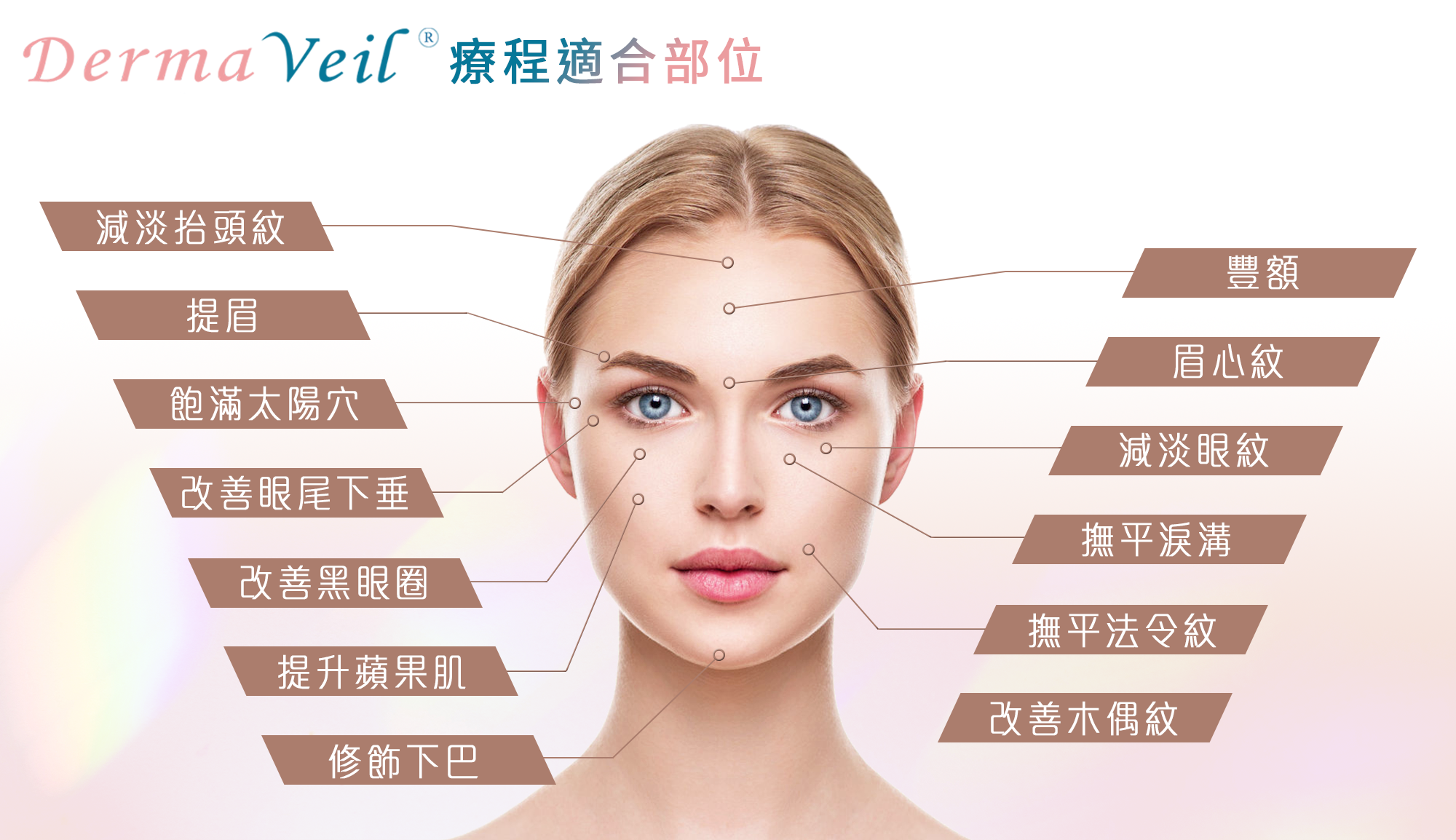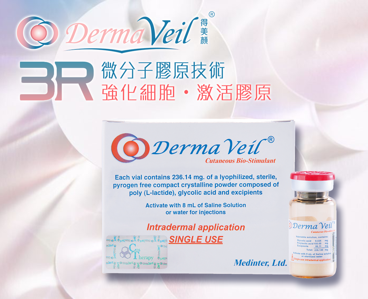 Derma Veil®是一種與生物相容及能被生物降解(體內自行分解代謝) 的可注射填充劑,由聚左乳酸 (PLLA) 組成。採用極微細分子膠原深入肌膚真皮層,強化纖維母細胞的生產動力,從而激活膠原母細胞自我增生骨膠原,緊緻肌膚。極微細分子呈不規則狀,膠原分佈更均勻,更自然。