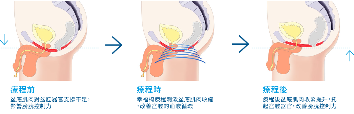 Emsella™ 利用全球唯一的HIFEM™技術,聚焦電磁波科技,為盆底肌進行過萬次收縮運動。過程中,肌肉的間接性收縮,可以改善盆腔的血液循環,有助增強其收縮能力,針對因盆底肌肉鬆弛所引致小便不順(滴尿)、尿頻問題,更有助提升性生活質素。