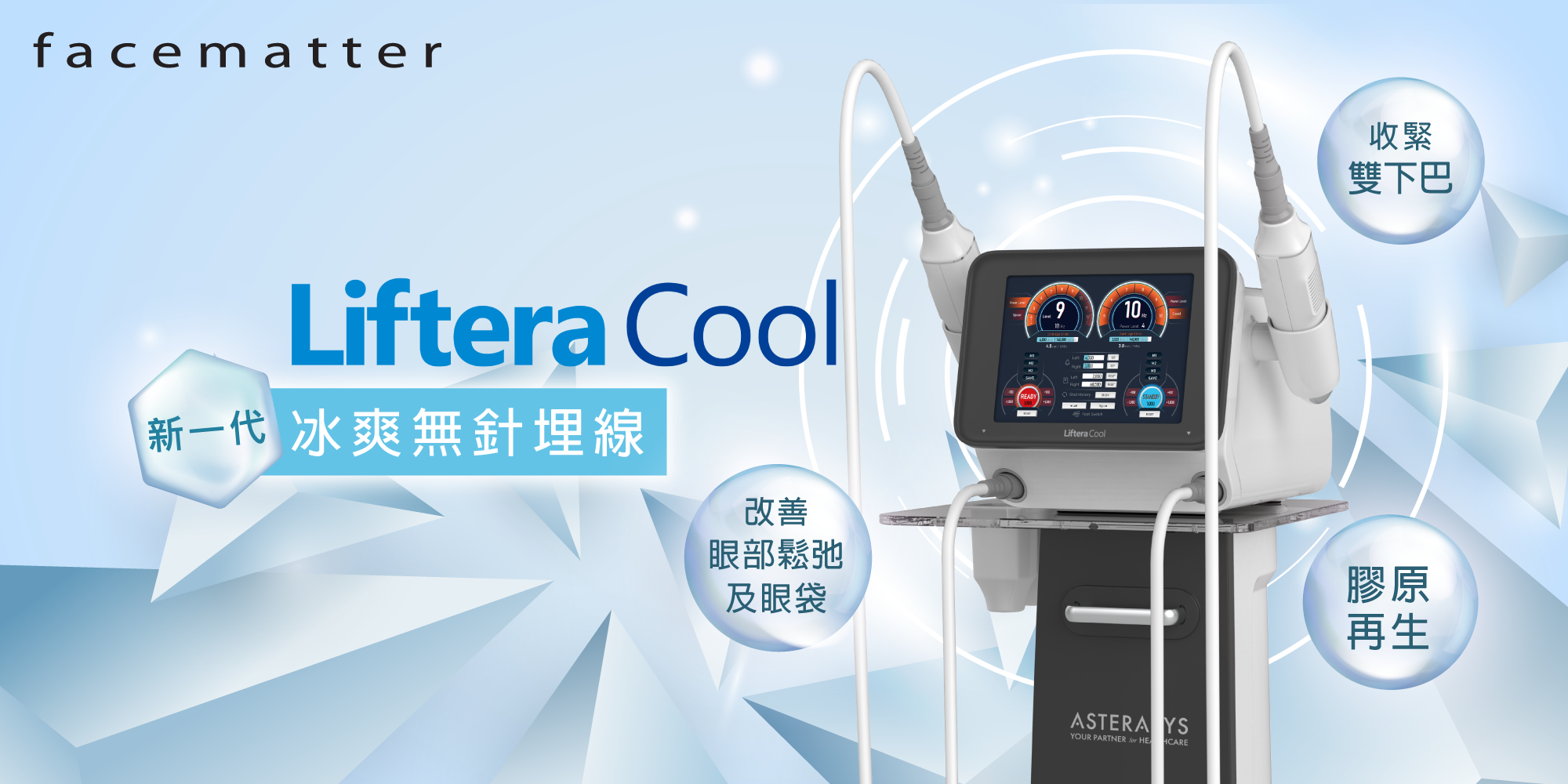 全新一代Liftera Cool無針埋線,加入了專利的ACC™(Active Conduction Cooling)主動傳導冷卻技術,治療頭內加入專利微型製冷組件,降低治療時的不適及熱痛感。療程舒適度提升外,還可視乎個人皮膚需要,增加能量,提升膠原再生效果。