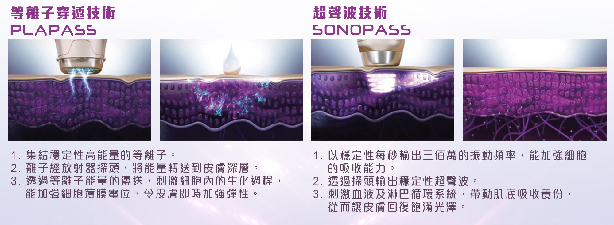 利用PLASONIC 等離子(PlaPass) + 超聲波(SonoPass)技術,透過DDSD(營養輸送系統裝置),誘導驚人且迅速“細胞自生吸收”的滲透能力。
